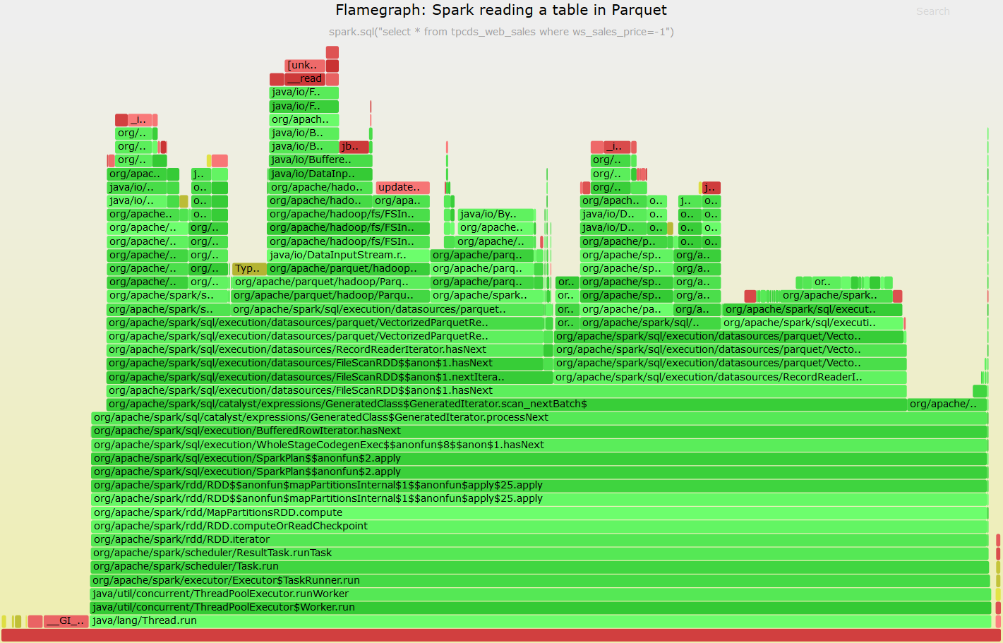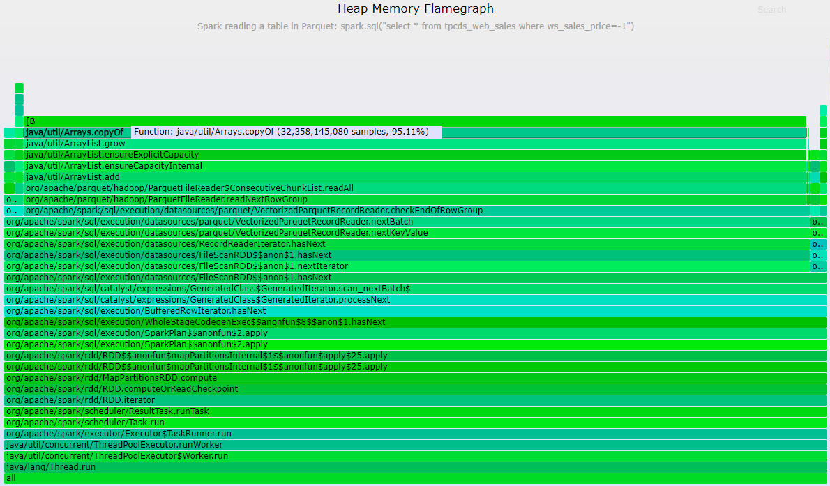In the first part of this post you will find an example and a few drill-down lab tests on profiling and understanding CPU-intensive Spark workloads. You will see examples of profiling the workload of a query reading from Parquet by measuring systems resources utilization using Spark metrics and OS tools, including tools for stack profiling and flame graph visualization and tools for dynamic tracing.