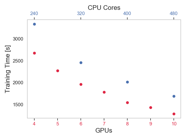 Figure 3: Selected measurements of the distributed training time for the Inclusive Classifier model using TensorFlow and tf.distribute with “multi worker mirror strategy”, training for 6 epochs, running on cloud resources, using CPU (2.0 GHz Intel Xeon Platinum 8167M) and GPU (Nvidia P100) nodes, on Oracle's OCI.